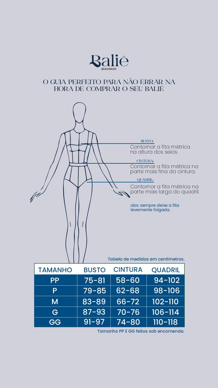 Importante: a modelagem da Baliê é exclusiva! Ou seja, não se baseie nas medidas de lojas de departamento — siga nossa tabela.